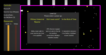 URANIUM x PIT is a physics-based chain-reaction roguelike where you fire neutrons into an unstable nuclear core and try to survive the inevitable disaster. Every shot coud level you up or create a nuclear disaster. Your job is to keep the machine alive long enough to level up, grab upgrades, and squeeze out just a little more power before everything goes critical.